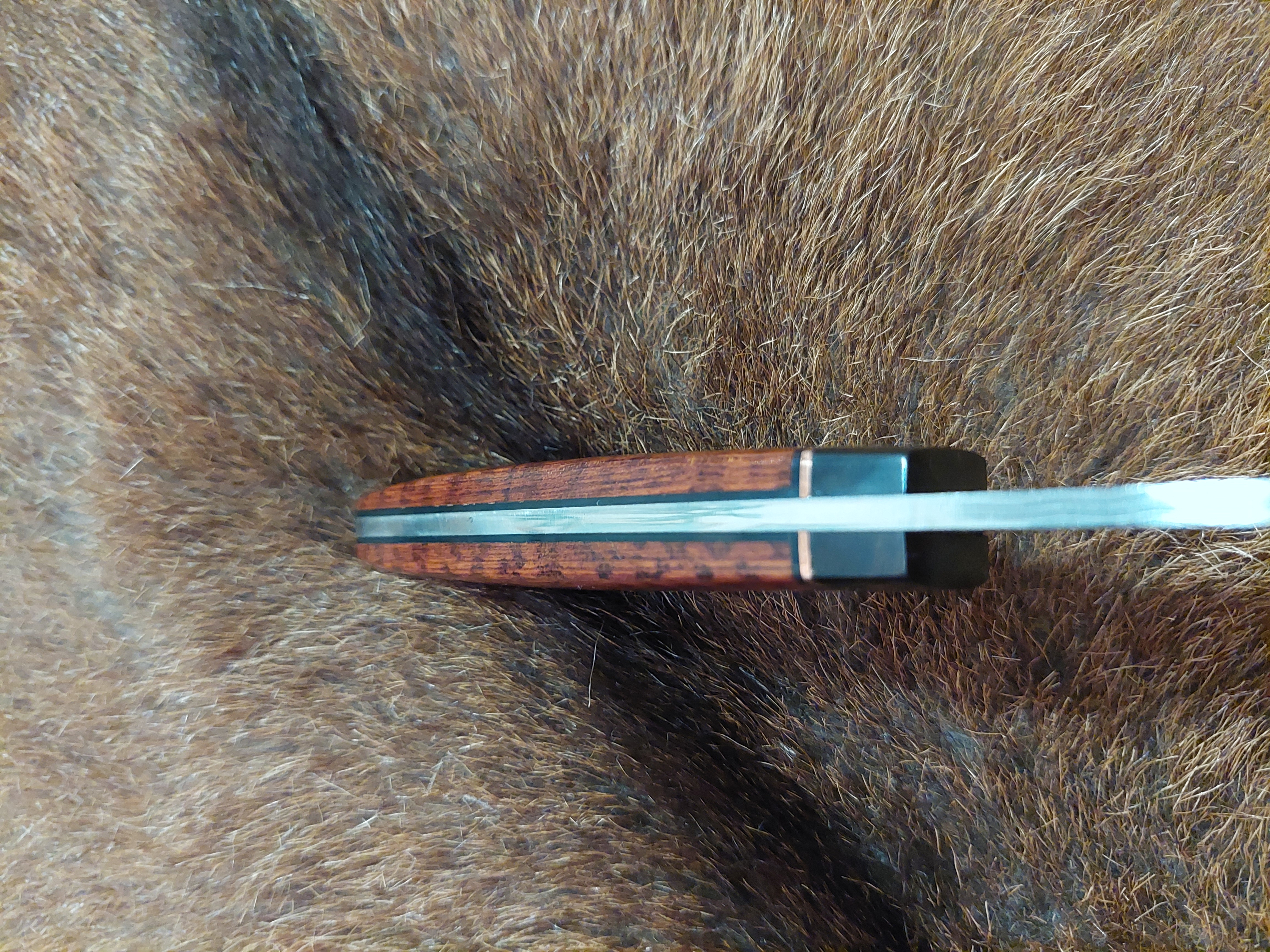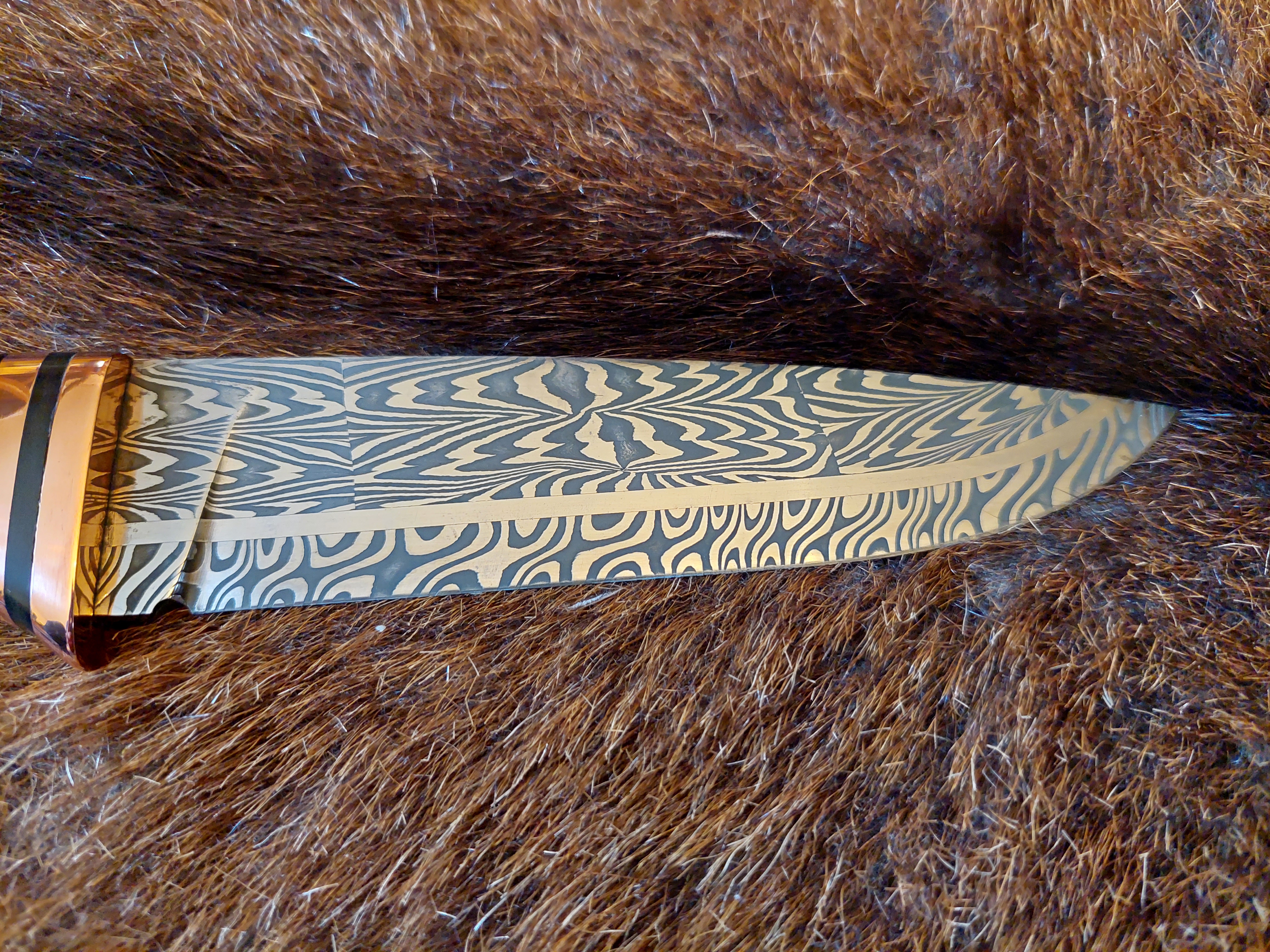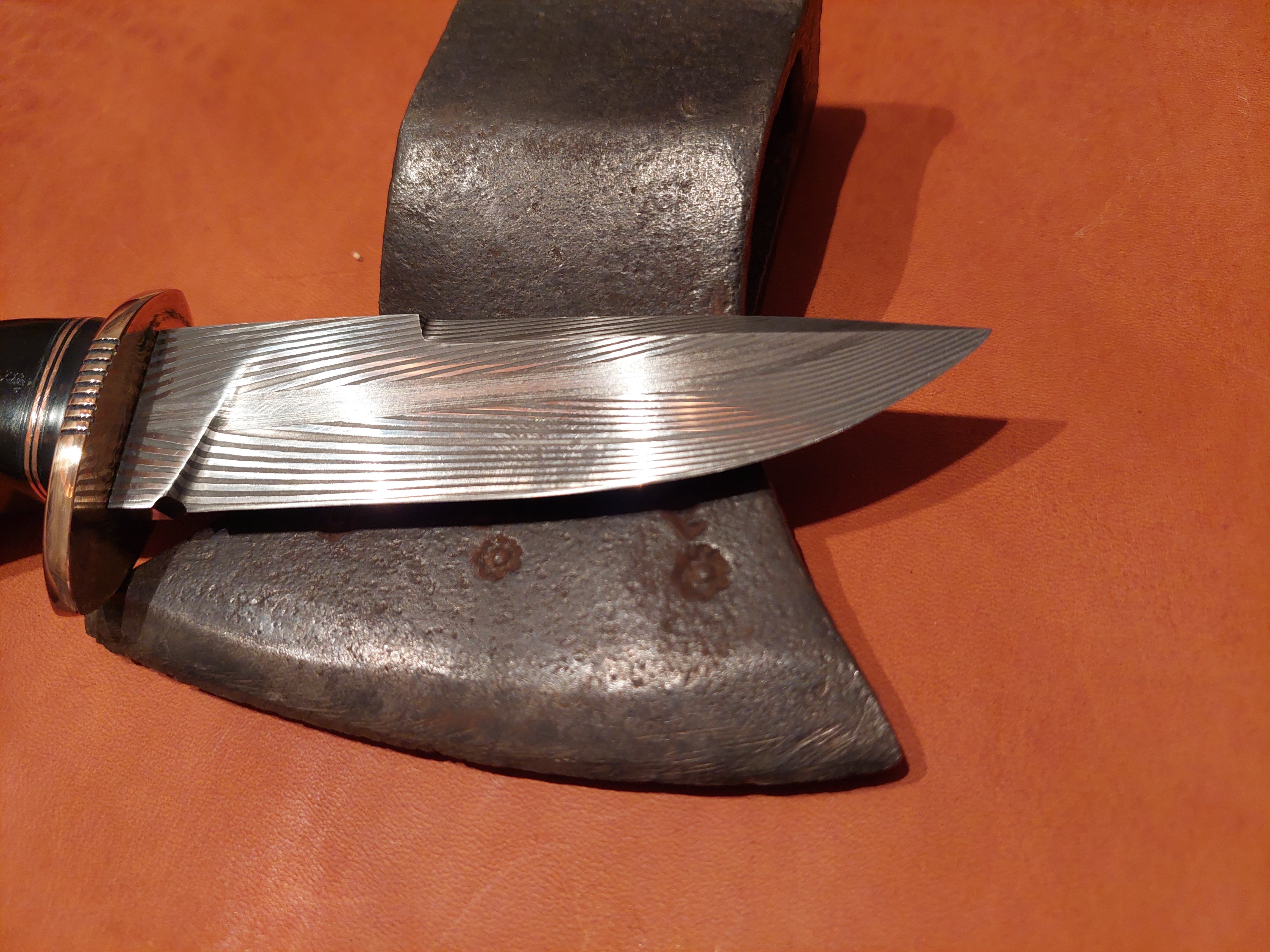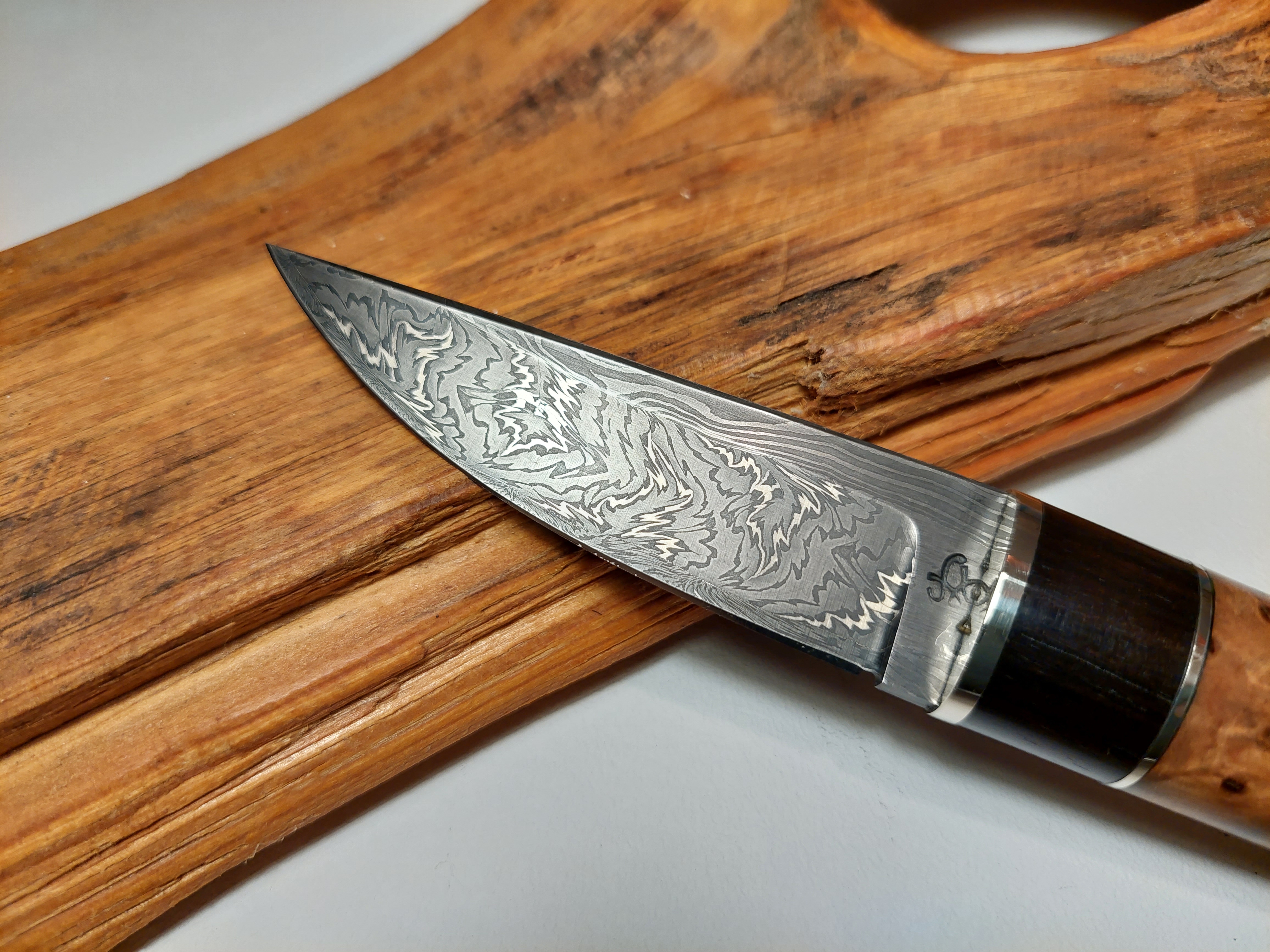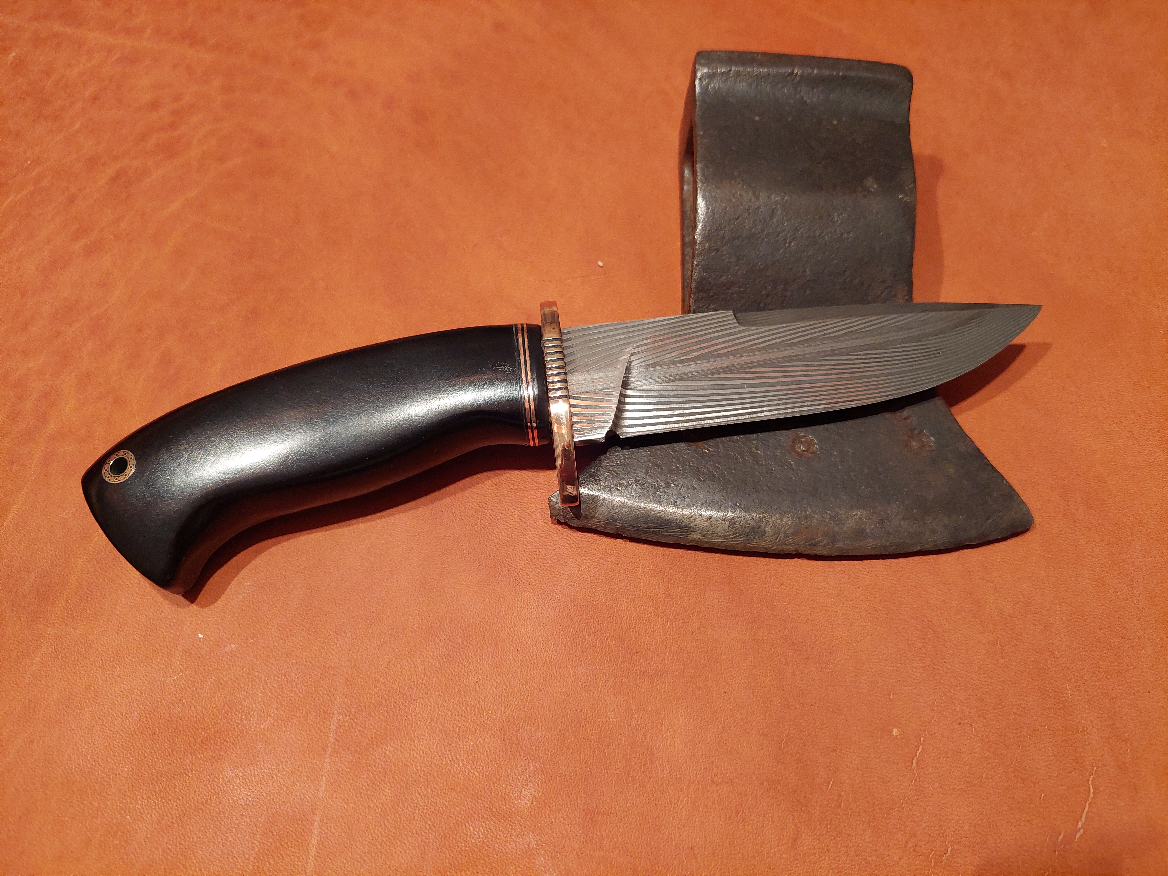Es liegt unglaublich gut in der Hand, sehr ausgewogen! Grenadil Holz, Mokume Gane, als Parierstück. Eine aussergewöhliche "BOWIE"-Klinge, gespiegelter Federdamast. Steckt in einer Messerhülle aus Rindsleder mit Sicherung.