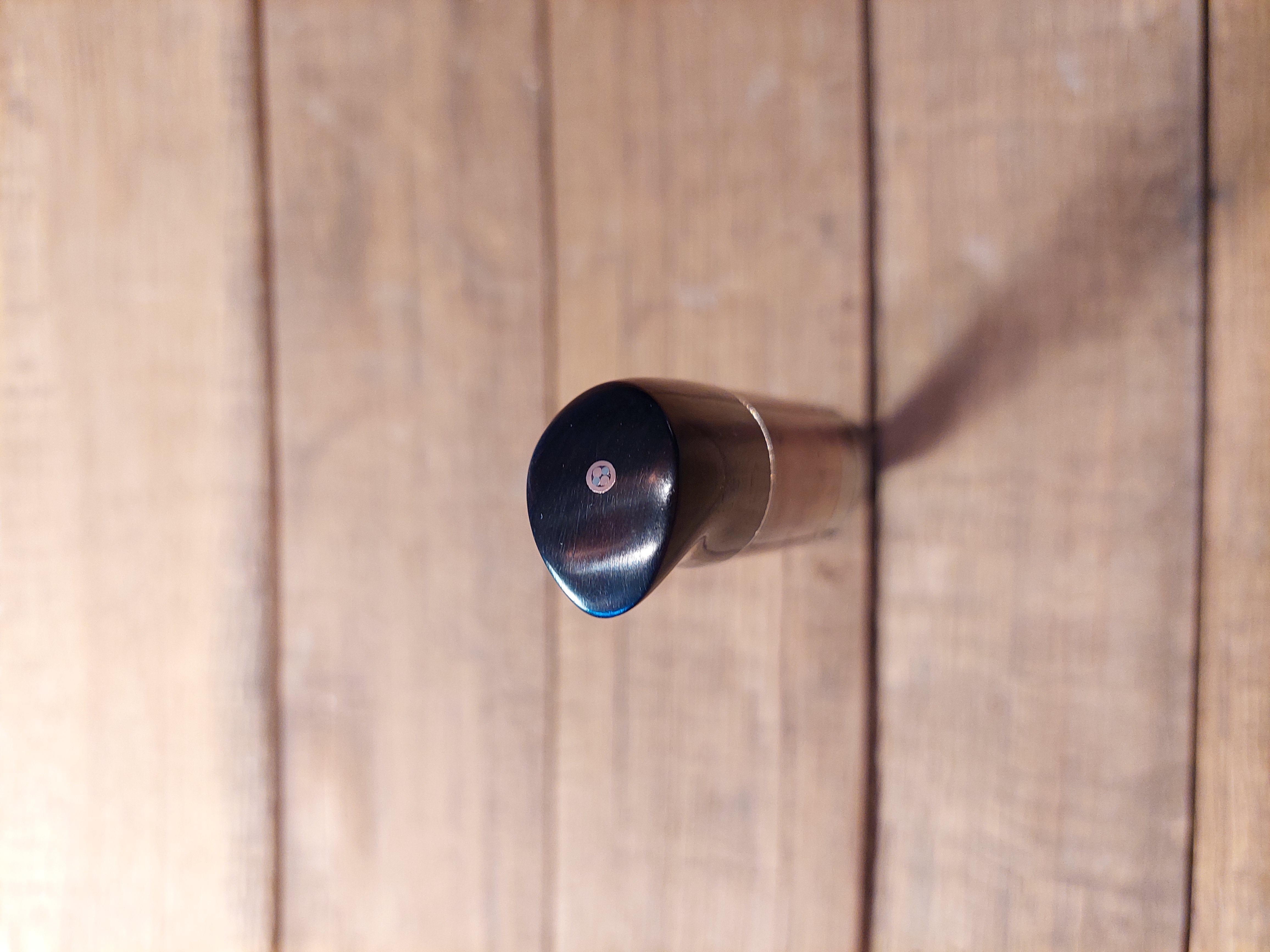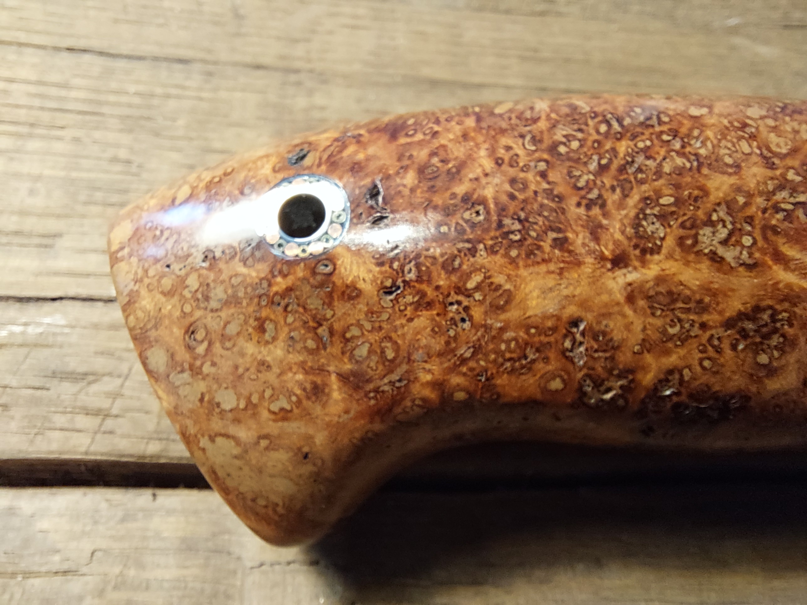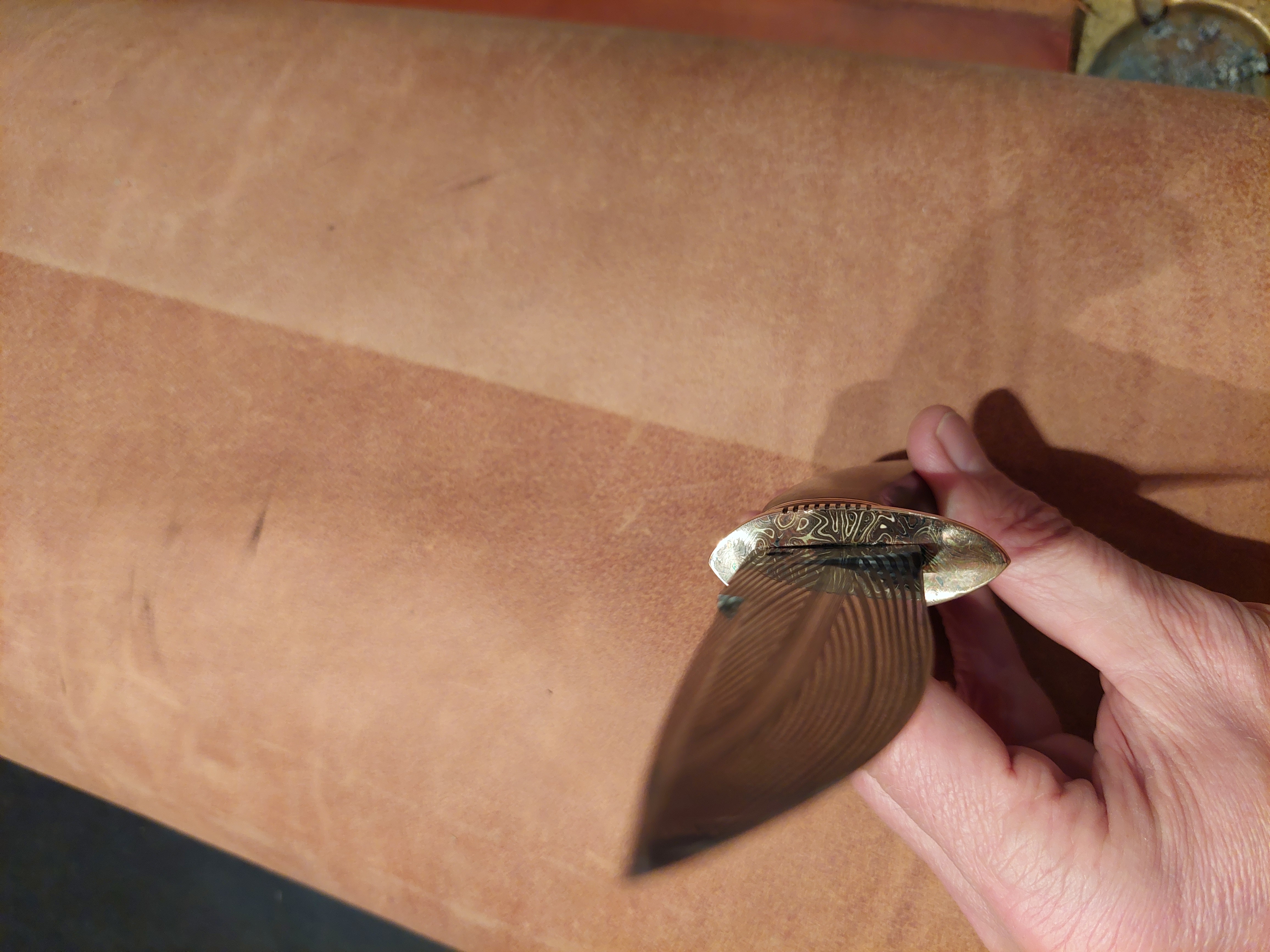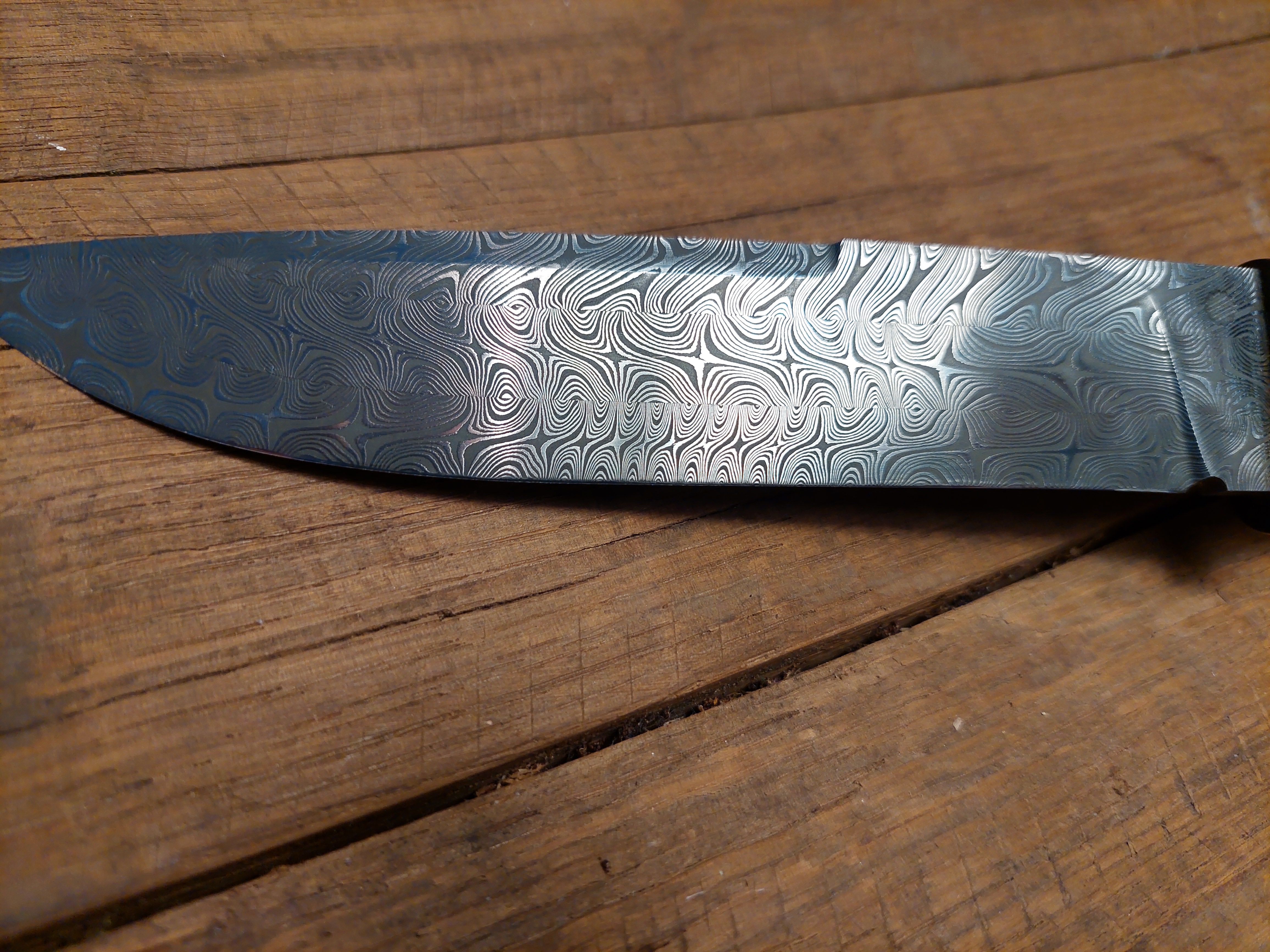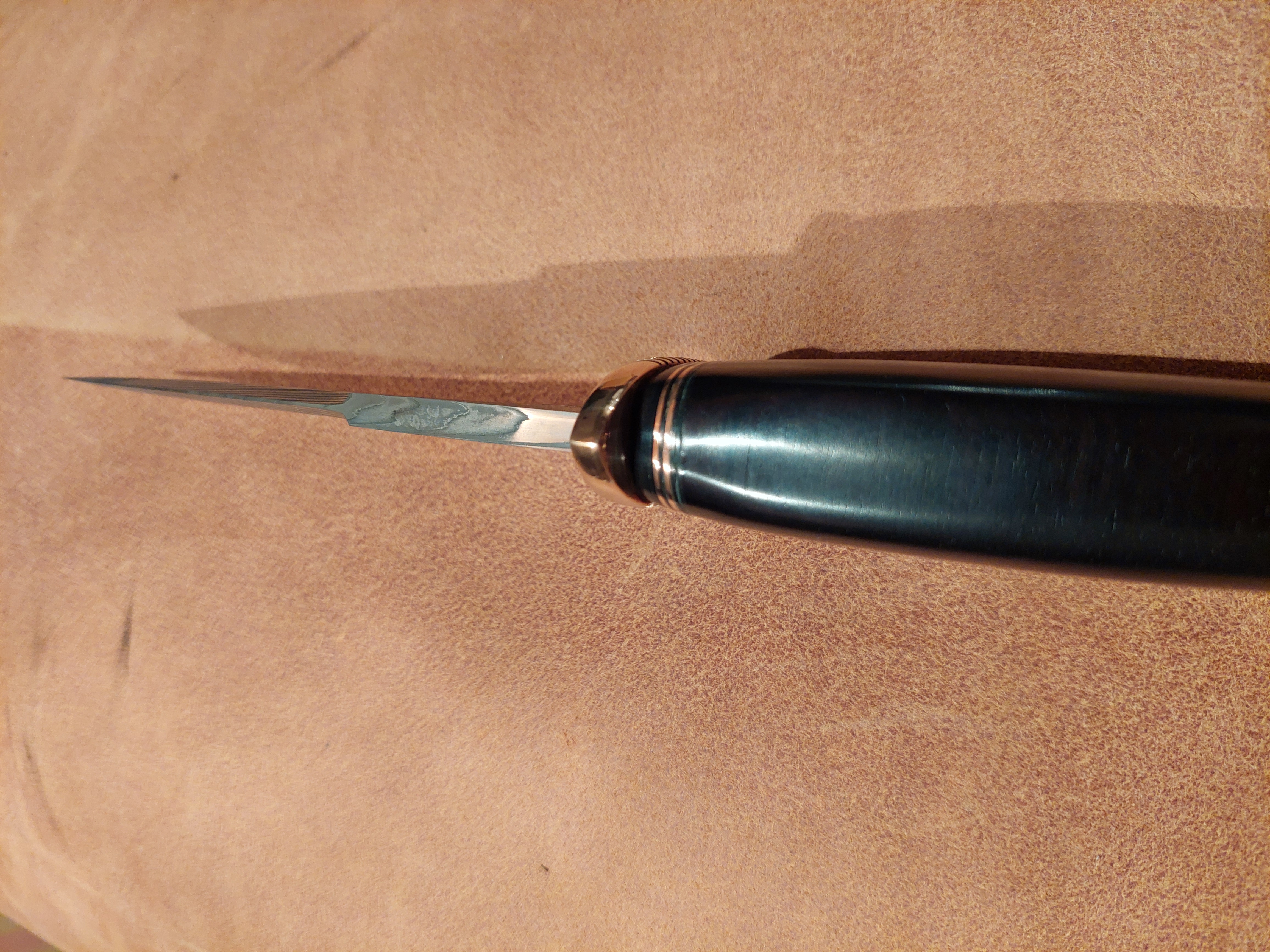 Es liegt unglaublich gut in der Hand, sehr ausgewogen! Grenadil Holz, Mokume Gane, als Parierstück. Eine aussergewöhliche "BOWIE"-Klinge, gespiegelter Federdamast. Steckt in einer Messerhülle aus Rindsleder mit Sicherung.