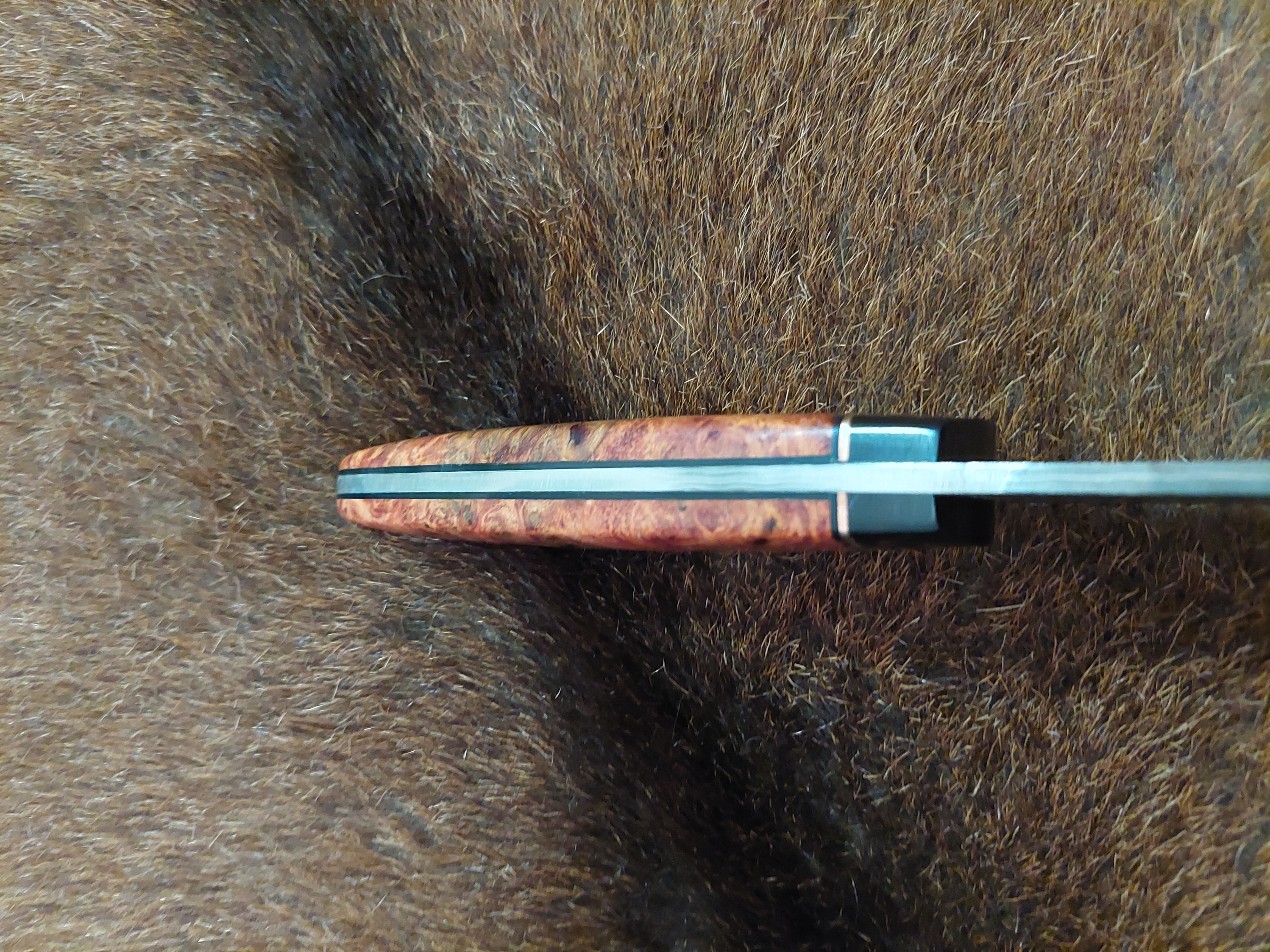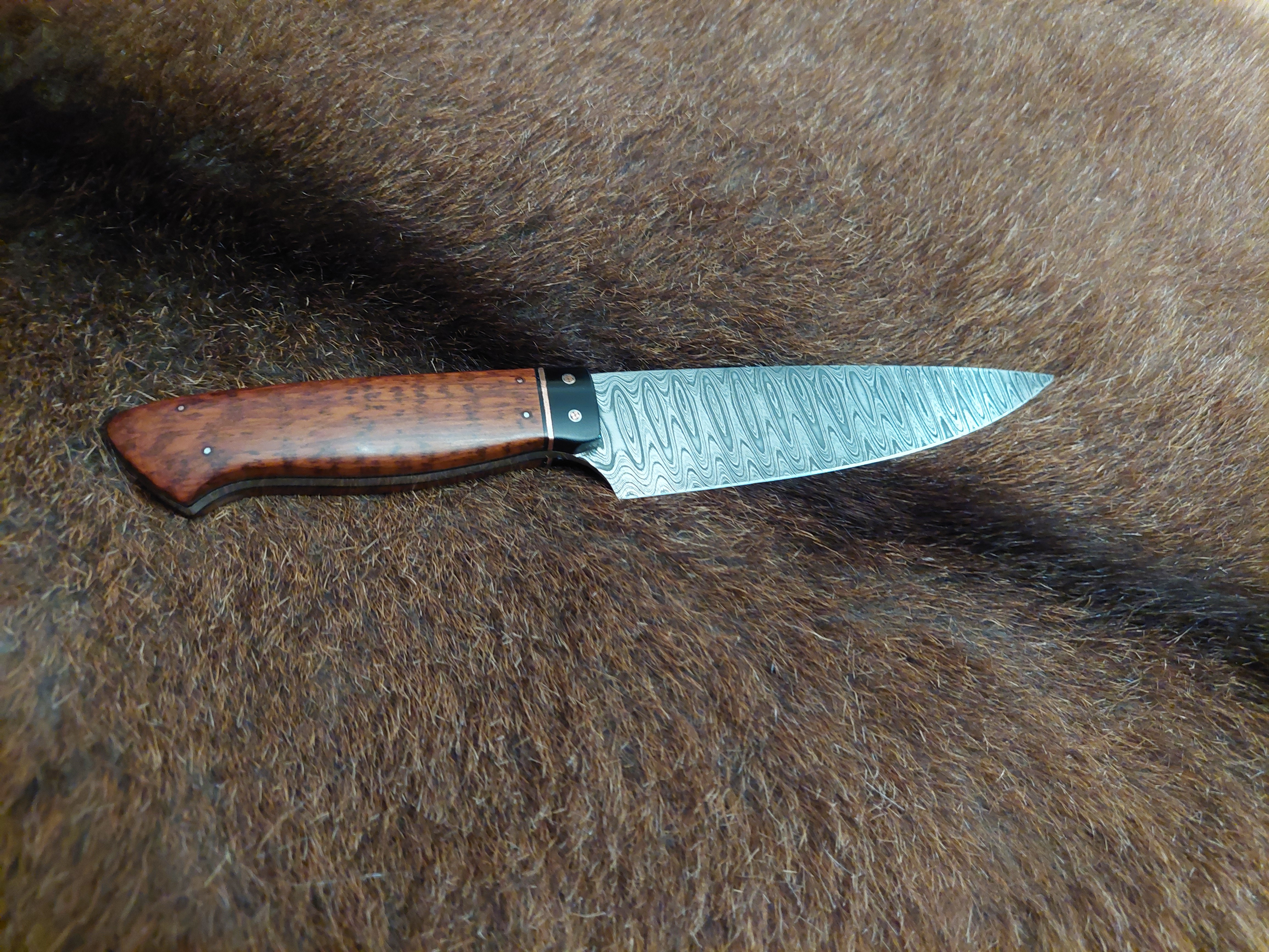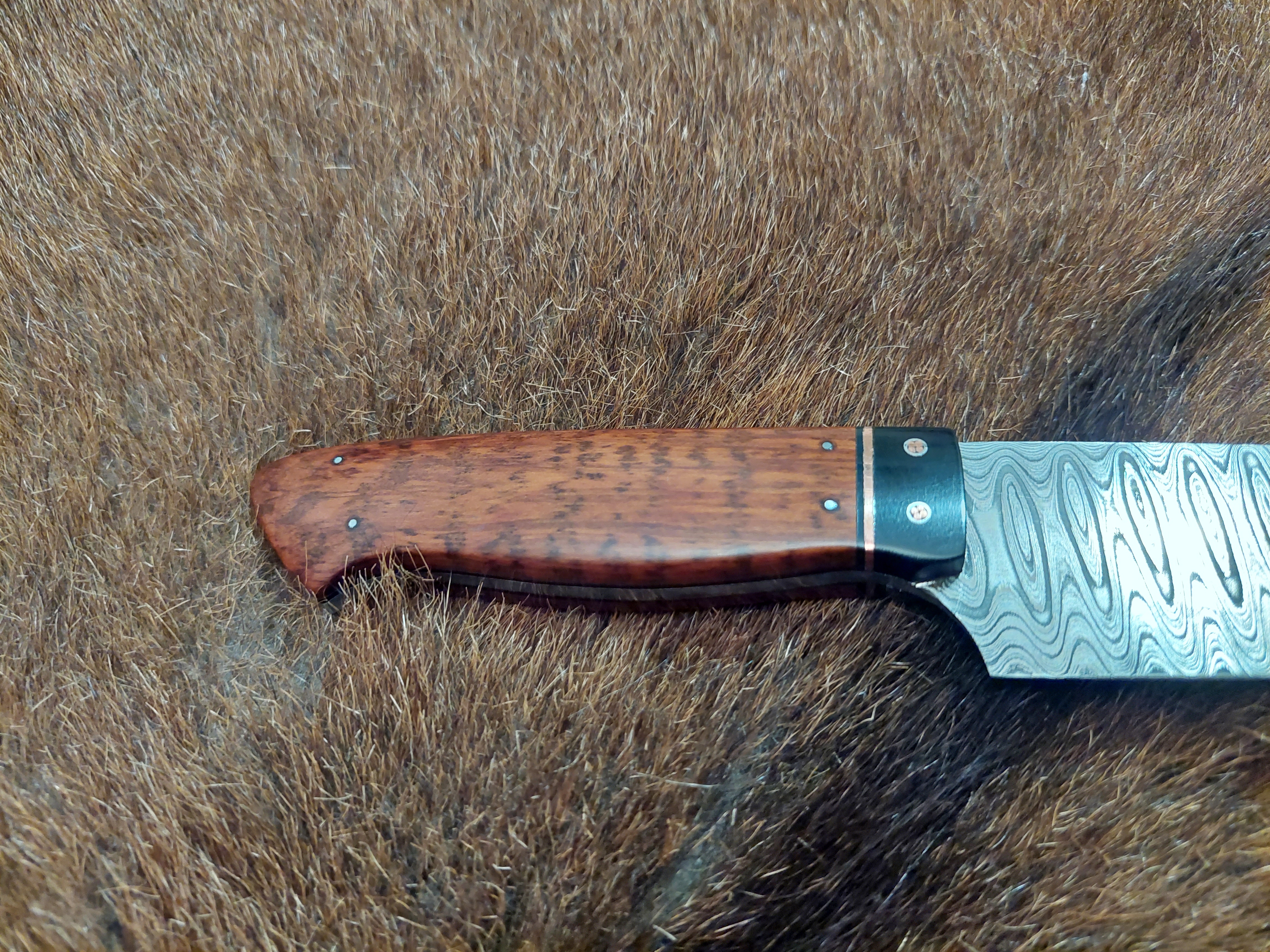 Preis: 595,-€ / 175mm, 85mm, 90gDas Kochmesser, etwas spitz..., als Integralklinge vielseitig als Hingucker, mit edlen Zutaten wie es sich in der Küche gehört. Der Damast in Wellenform ist quasi eine Prägung. Amboina Holz als Griffschalen. Das Parierstück, Grenadil Holz mit kupfernen Mosaikpins.