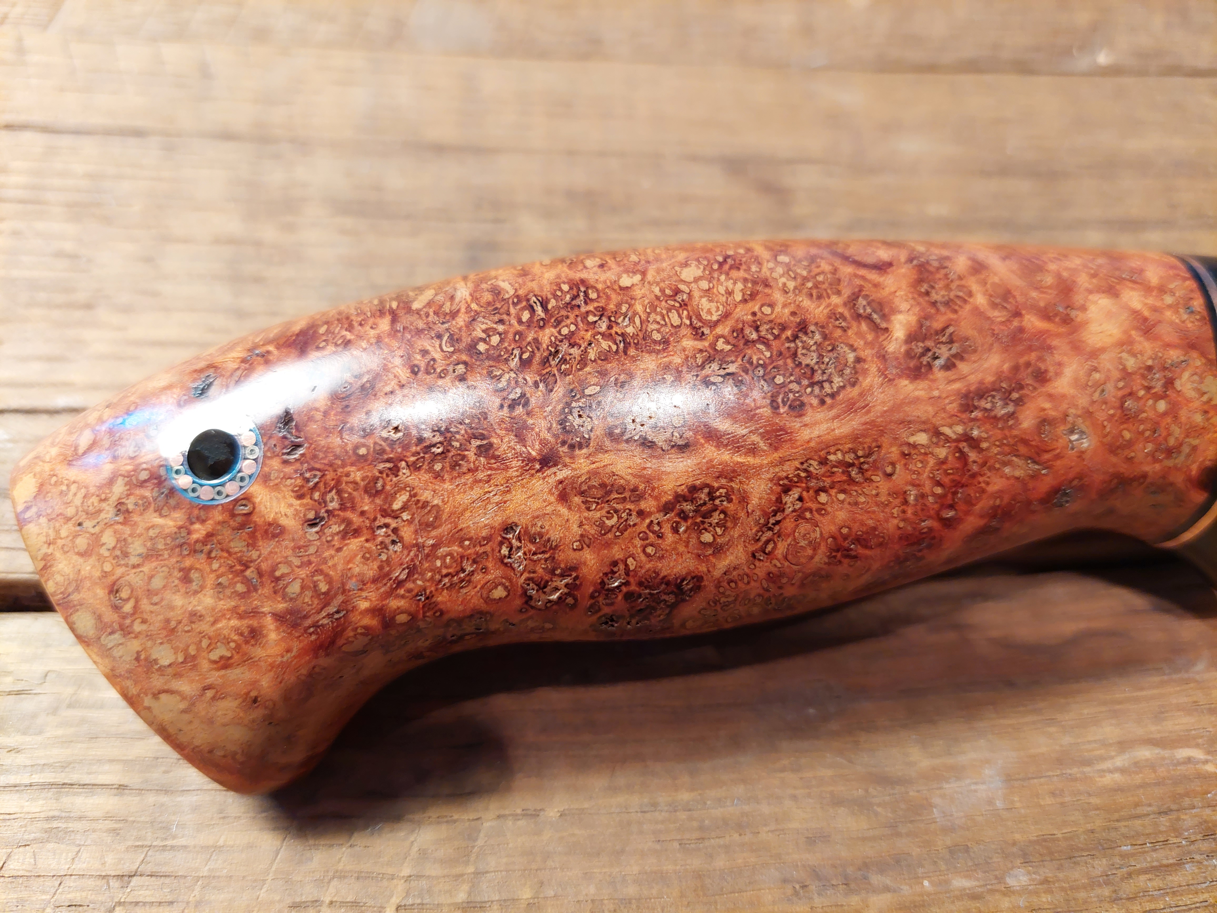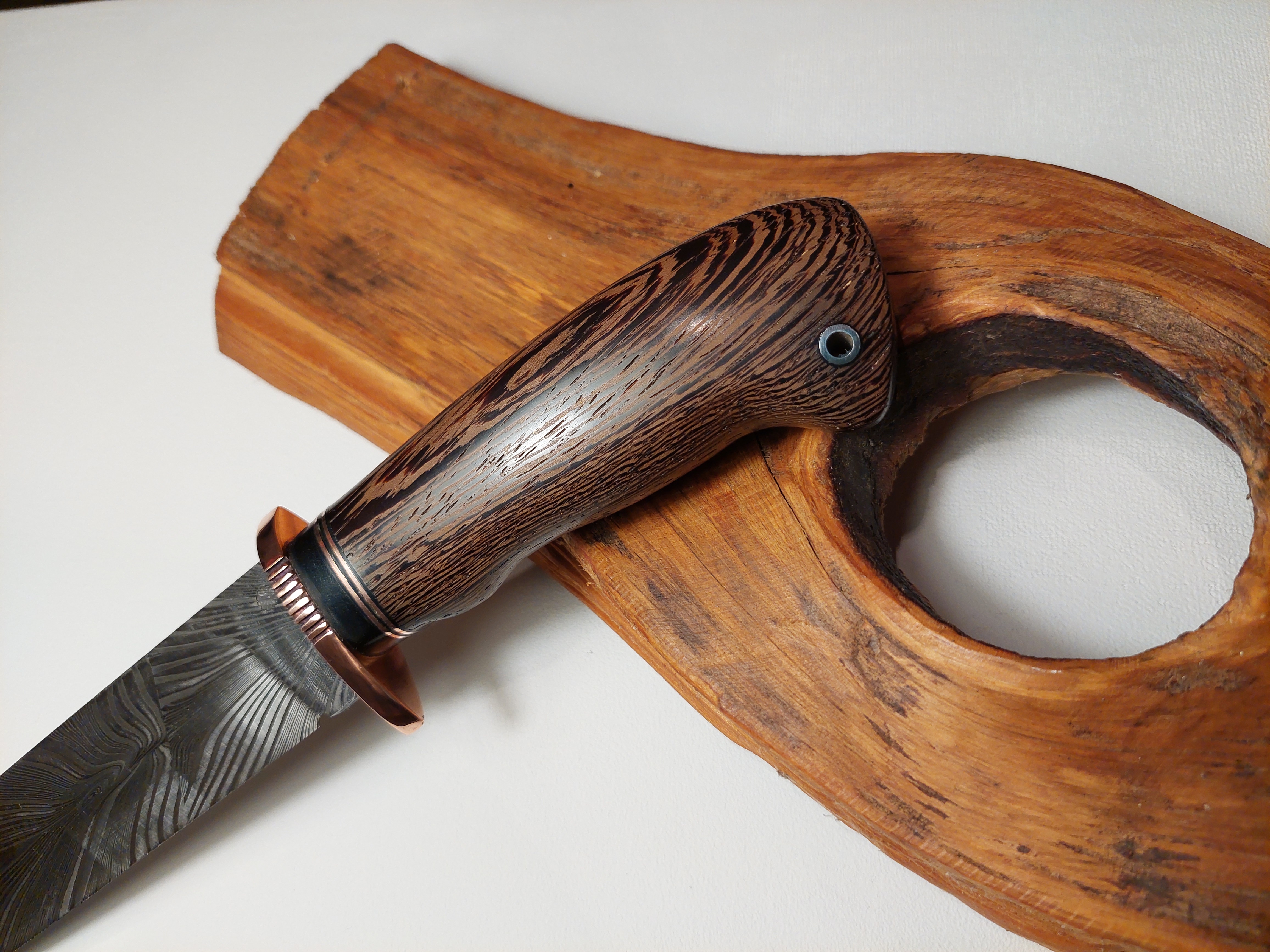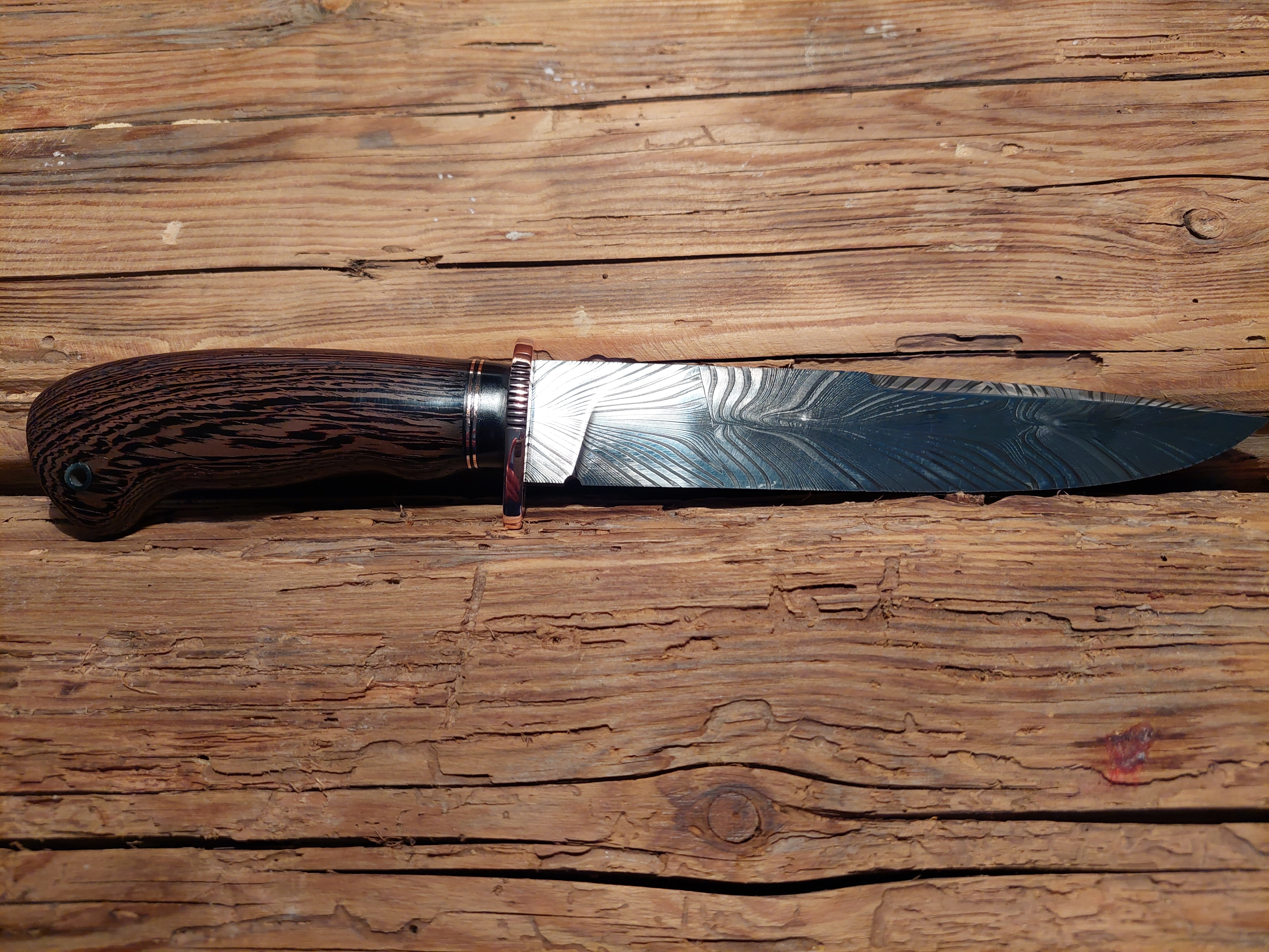 Preis: 595,-€ / 175mm, 85mm, 90gDas Kochmesser, etwas spitz..., als Integralklinge vielseitig als Hingucker, mit edlen Zutaten wie es sich in der Küche gehört. Der Damast in Wellenform ist quasi eine Prägung. Amboina Holz als Griffschalen. Das Parierstück, Grenadil Holz mit kupfernen Mosaikpins.