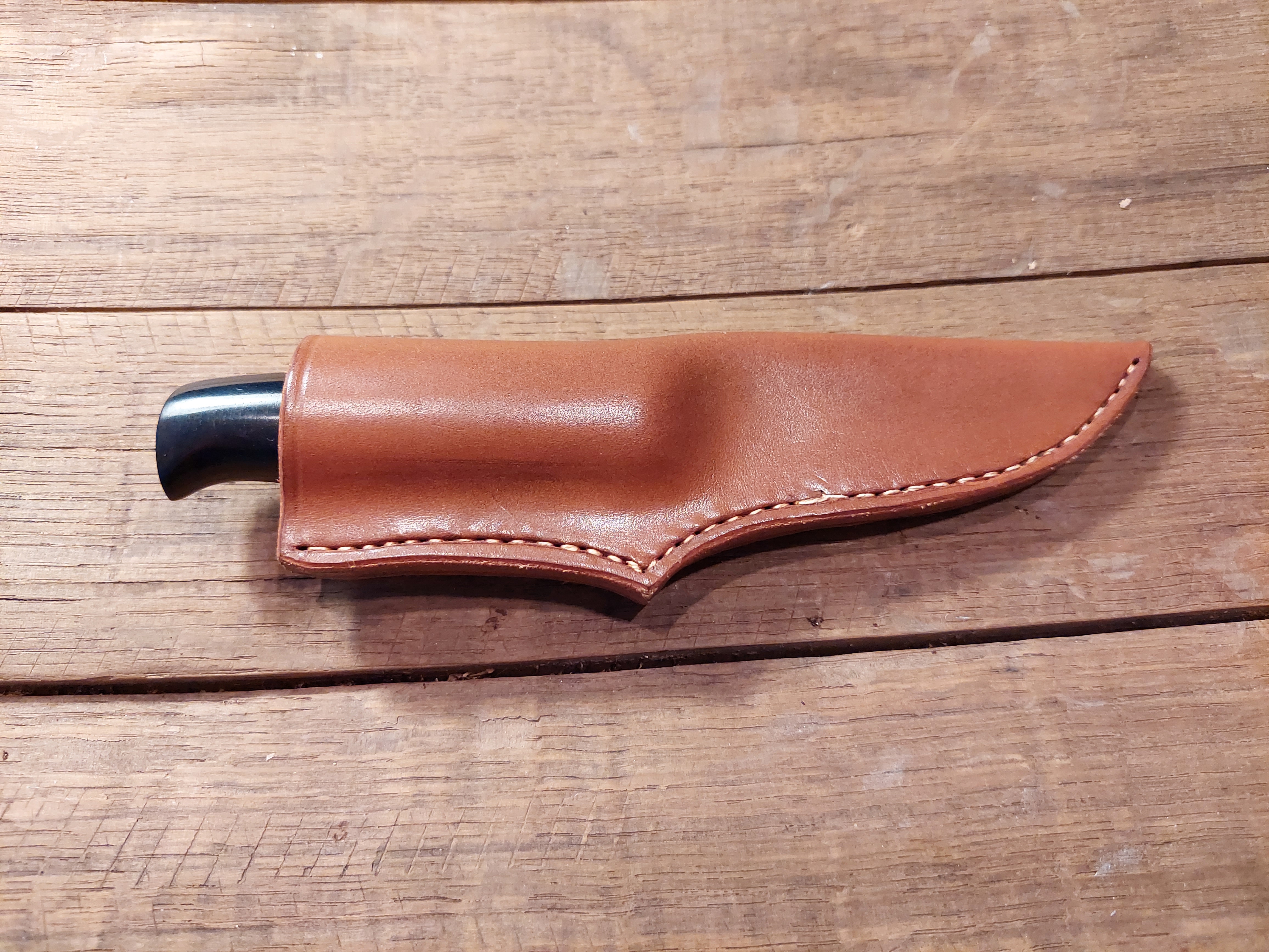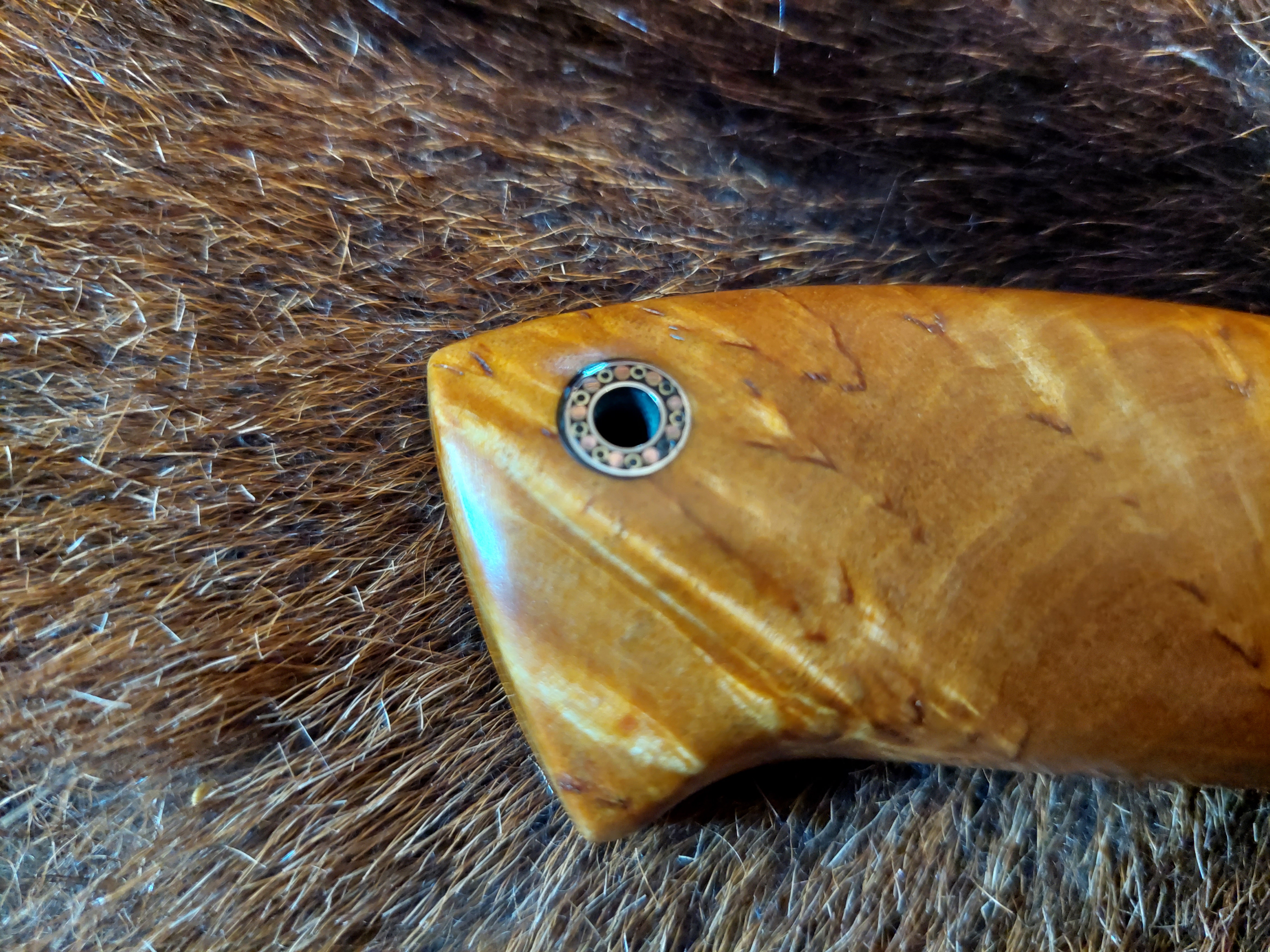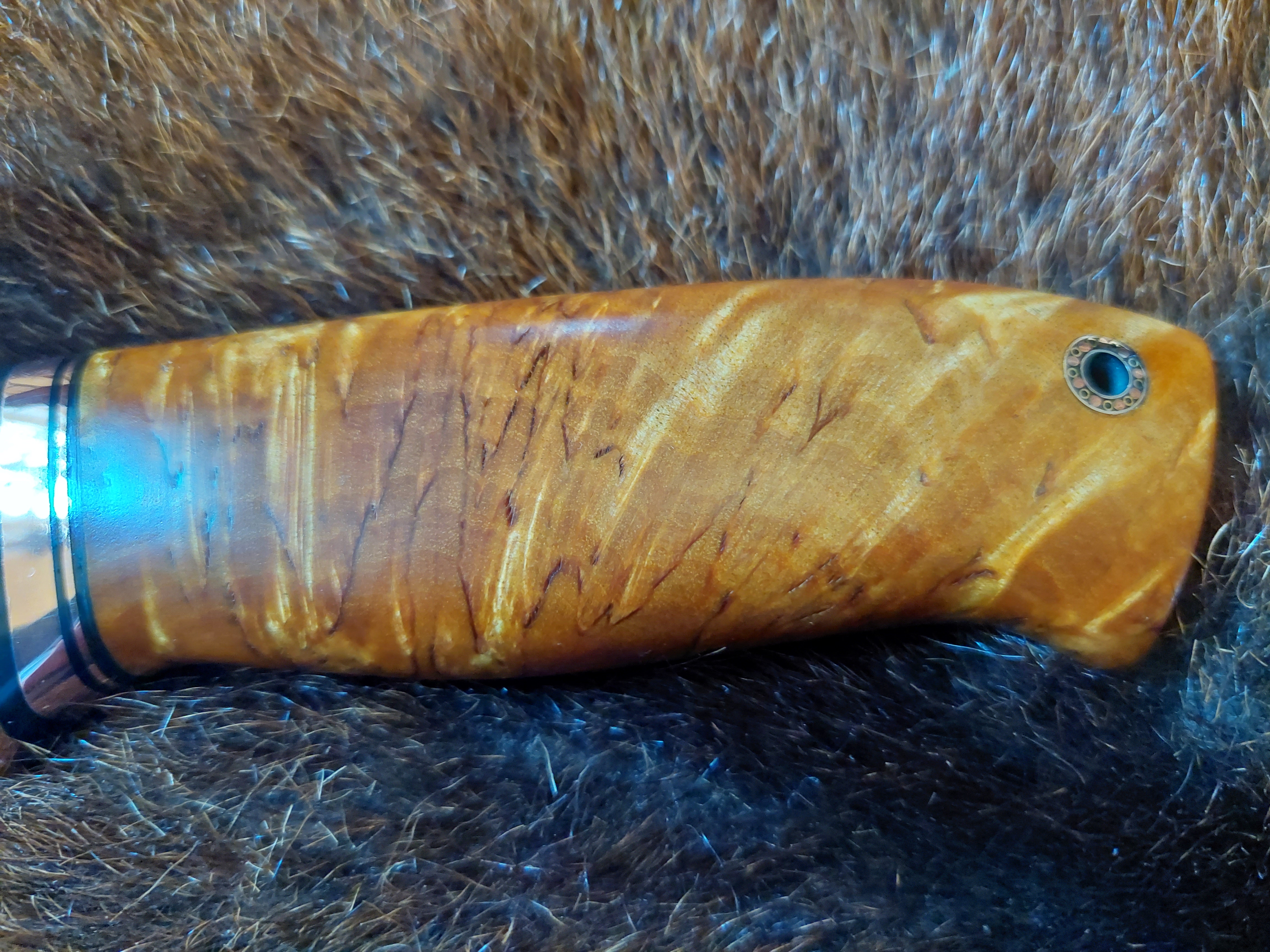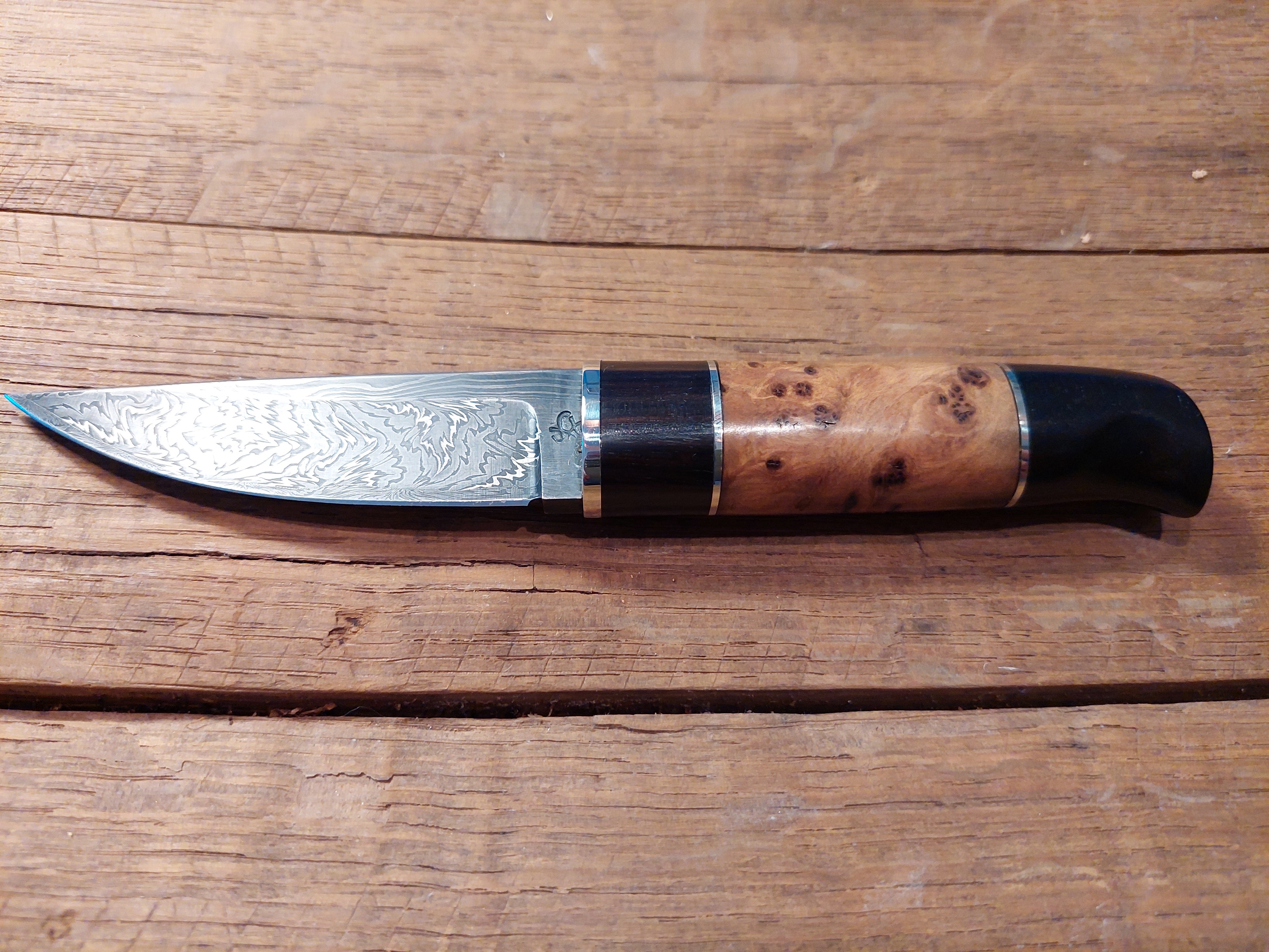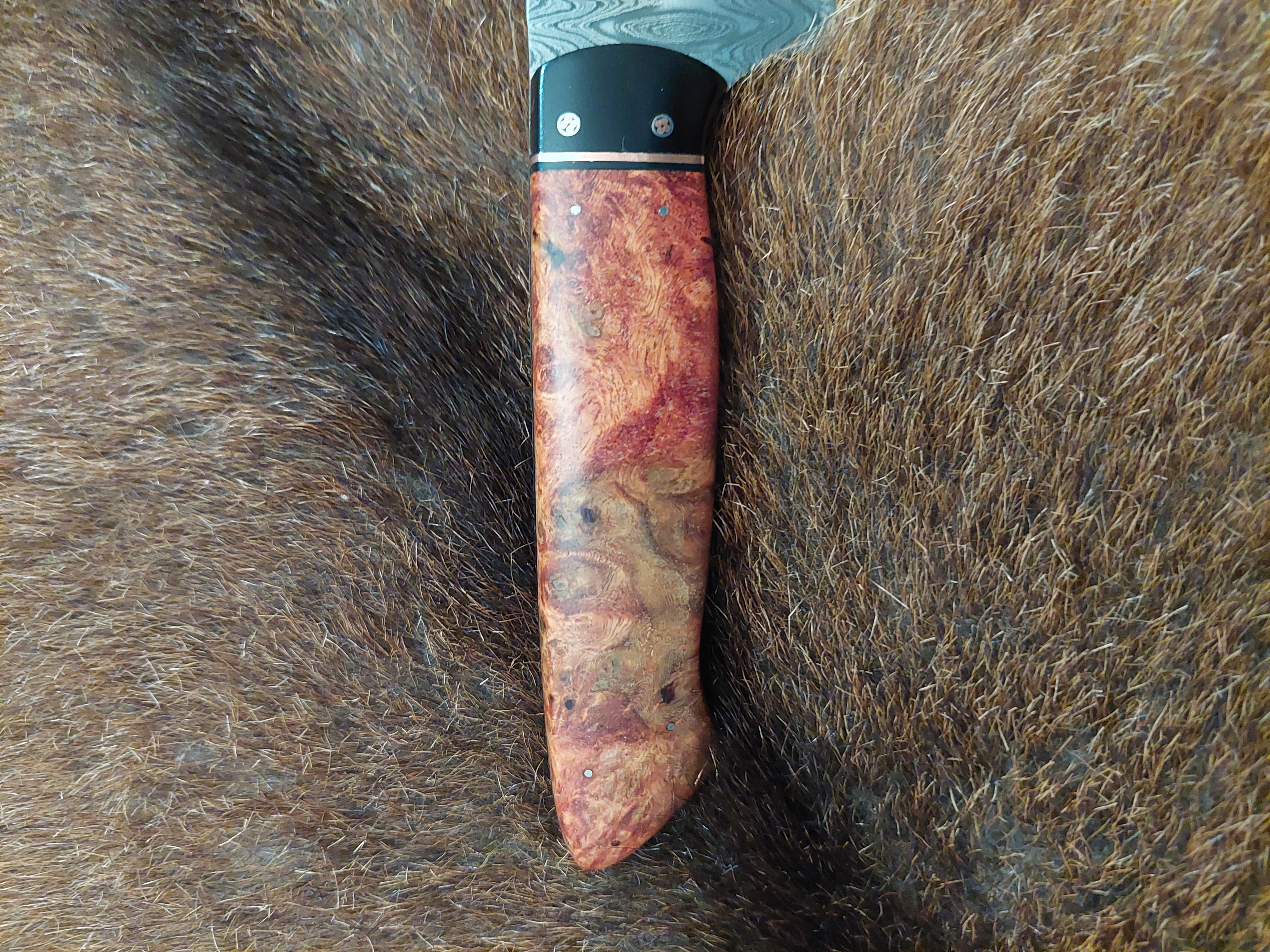Preis: 1.290,-€ / 240mm, 125mm, 280gDen nordischen Charakter sieht man dem Damastmesser sofort an. Birke Maserholz mit reichlich Kupfer als Parierstück. Die "DROPPOINT" Klinge aus Mosaik- und Exlosionsdamast. Die Rindsleder Hülle ist sehr passgenau genäht und kommt ohne Sicherung aus.