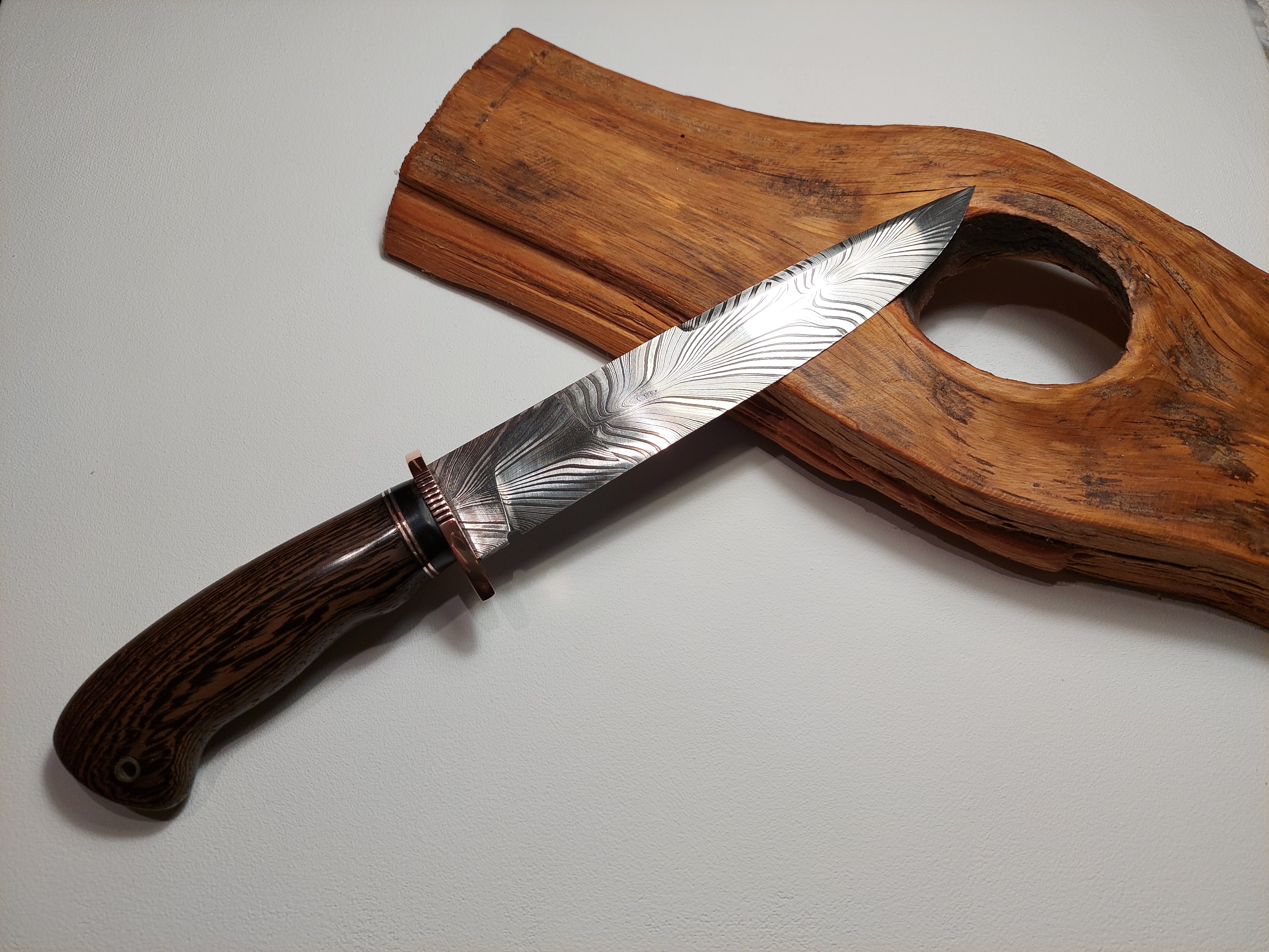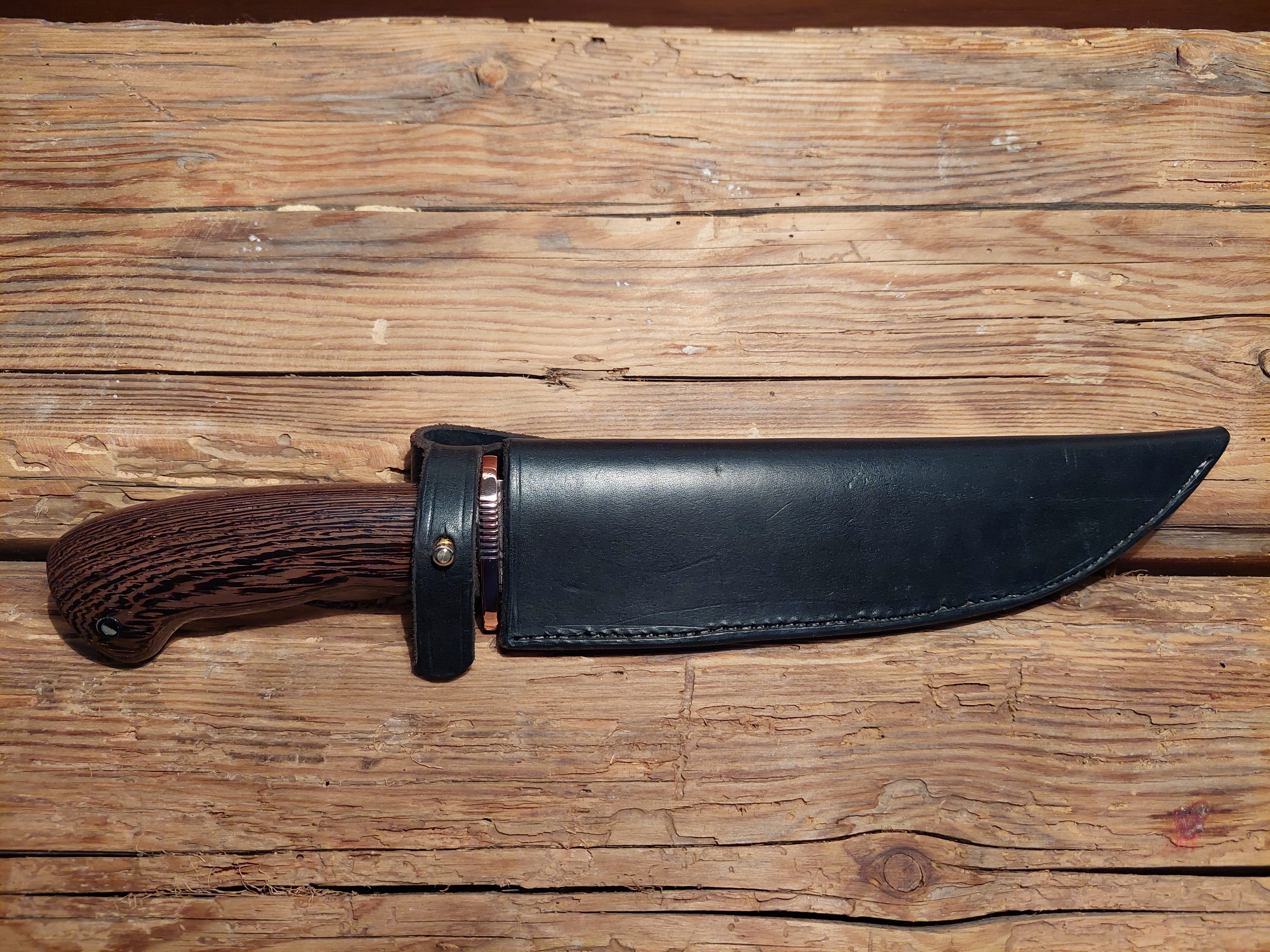 Preis auf Anfrage / 280mm, 155 mm, 195gHatte Krokodil Dandy nicht so etwas Ähnliches? Die schlanke "Bowie" Klinge geschmiedet von Jan Krauter ist ein Meisterstück. Wengeholz und Kupfer sind hier die Griffmaterialien. Eine Messerhülle aus handgenähtem Rindsleder mit Sicherung. Alles sehr solide.